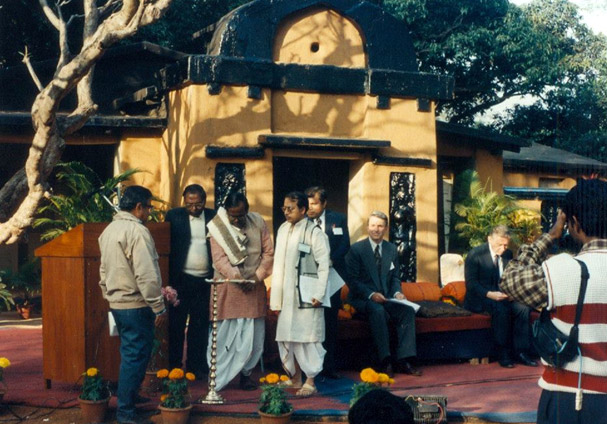 Professors Dilip K. Sinha (Vice-Chancellor of Visva Bharati, Santiniketan, India) and Subhash C. Basak are inaugurating the First Indo-US Workshop on Mathematical Chemistry on 9 January 1998 with the lighting of the holy lamp in the perennial Indian tradition. The inaugural function took place under the auspicious mango trees of Visva Bharati. |